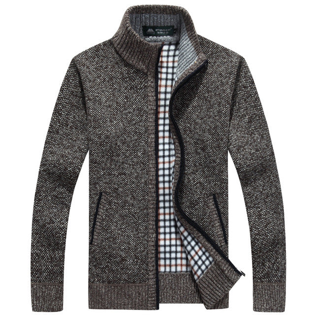 Knitted, cotton cardigan style with stand collar perfect for winter.